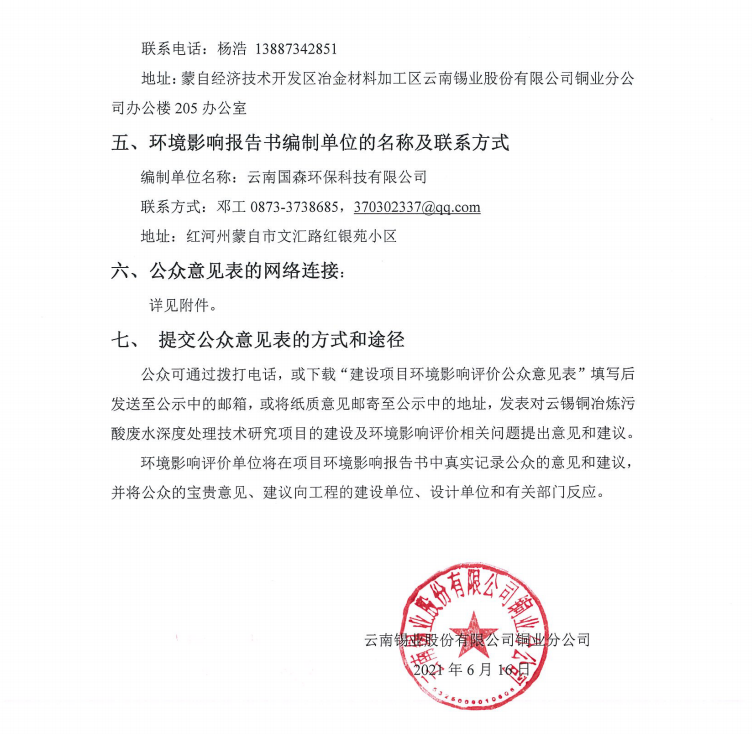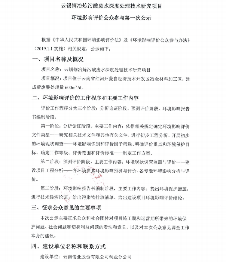 云錫銅冶煉污酸廢水深度處理技術(shù)研究項(xiàng)目環(huán)境影響評(píng)價(jià)公眾參與第一次公示