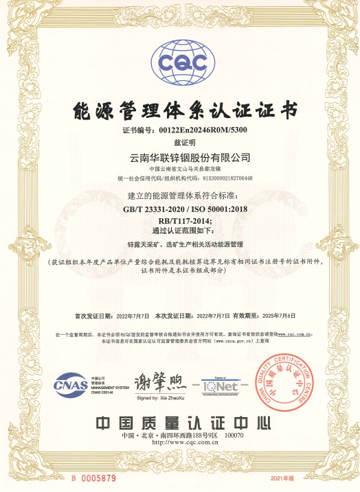 華聯(lián)鋅銦公司于2021年下旬啟動能源管理體系認證工作,前期邀請專家培訓相關標準、法規(guī),隨后開始準備一系列申報材料,于2022年6月組織開展能源管理體系外部審核工作,由中國檢驗認證集團云南有限公司相關專家組進行評審并一致通過,隨后審核專家將申報材料與過程審核資料上傳至中國質量認證中心進行監(jiān)督評審。經(jīng)過層層審核與改進公司能源管理體系建設最終通過評審,并由中國質量認證中心頒發(fā)證書。