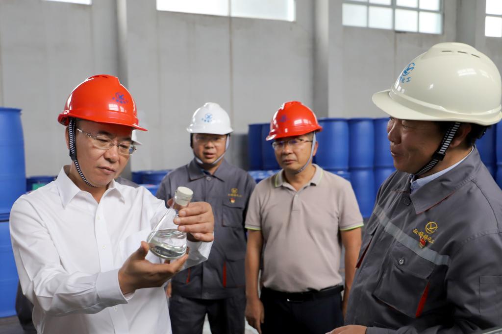 在錫化工有機錫生產基地,孫勇實地查看了丁基錫生產線、丁基錫自動控制室、甲基錫產品庫房及“化合錫世界”綜合展廳,詳細詢問錫化工生產經營情況、產品種類、產品用途、市場優勢及黨建工作開展情況。