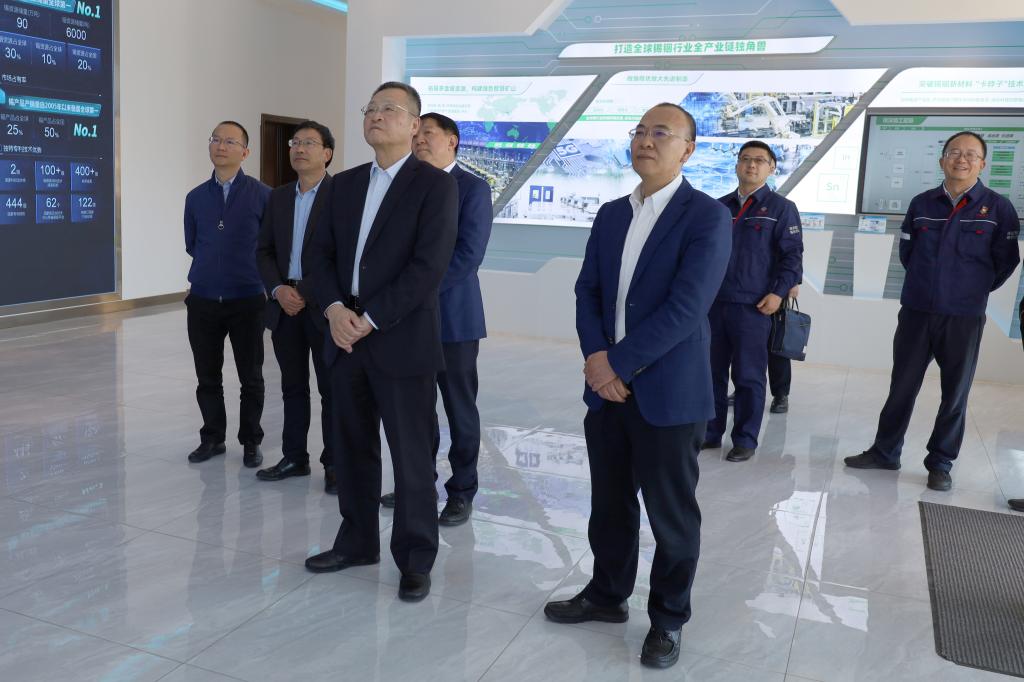 11月18日,全國政協常委、中國有色金屬協會會長葛紅林,中鋁集團總經理助理、中國銅業黨委書記、董事長許波一行到錫材公司調研指導。控股公司黨委書記、董事長孫勇介紹云錫生產經營、改革發展相關工作情況。