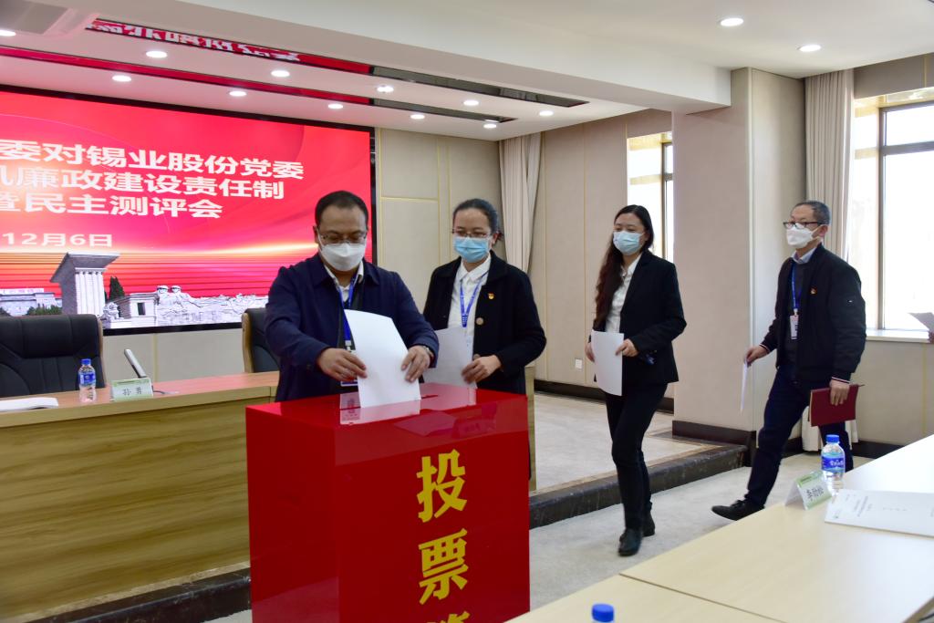 參會人員對錫業(yè)股份班子成員落實管黨治黨責(zé)任、推進黨風(fēng)廉政建設(shè)和反腐敗工作及領(lǐng)導(dǎo)干部述責(zé)述廉等情況進行了民主測評。會后還進行了個別談話。