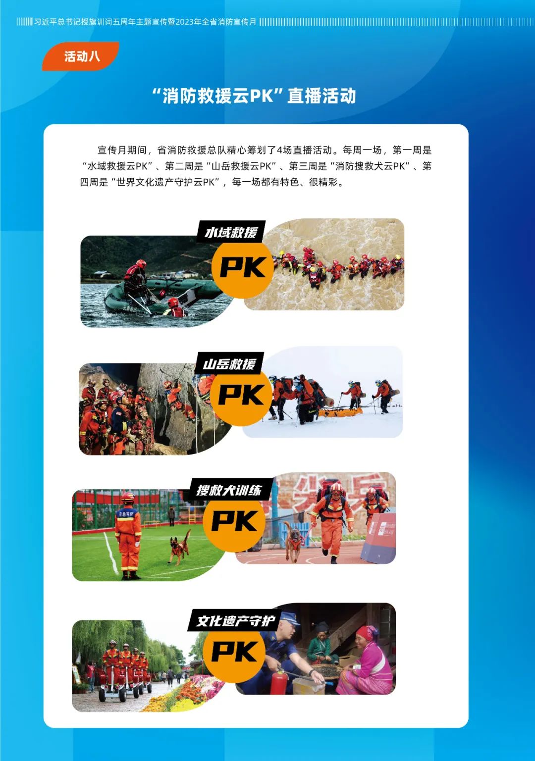 宣傳月期間,省消防救援總隊精心籌劃了4場直播活動,每周一場,第一周是“水域救援云PK”、第二周是“山岳救援云PK”、第三周是“消防搜救犬云PK”、第四周是“世界文化遺產(chǎn)守護云PK”,每一場都有特色、很精彩。