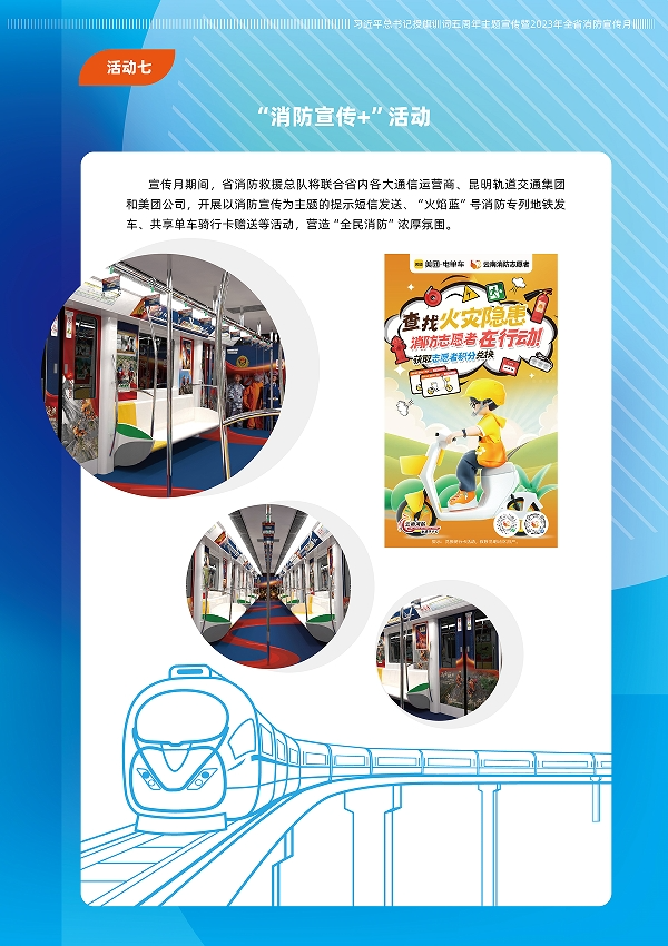 宣傳月期間,省消防救援總隊將聯(lián)合省內(nèi)各大通信運營商、昆明軌道交通集團和美團公司,開展以消防宣傳為主題的提示短信發(fā)送、“火焰藍”號消防專列地鐵發(fā)車、共享單車騎行卡贈送等活動,營造“全民學消防”的濃厚氛圍。