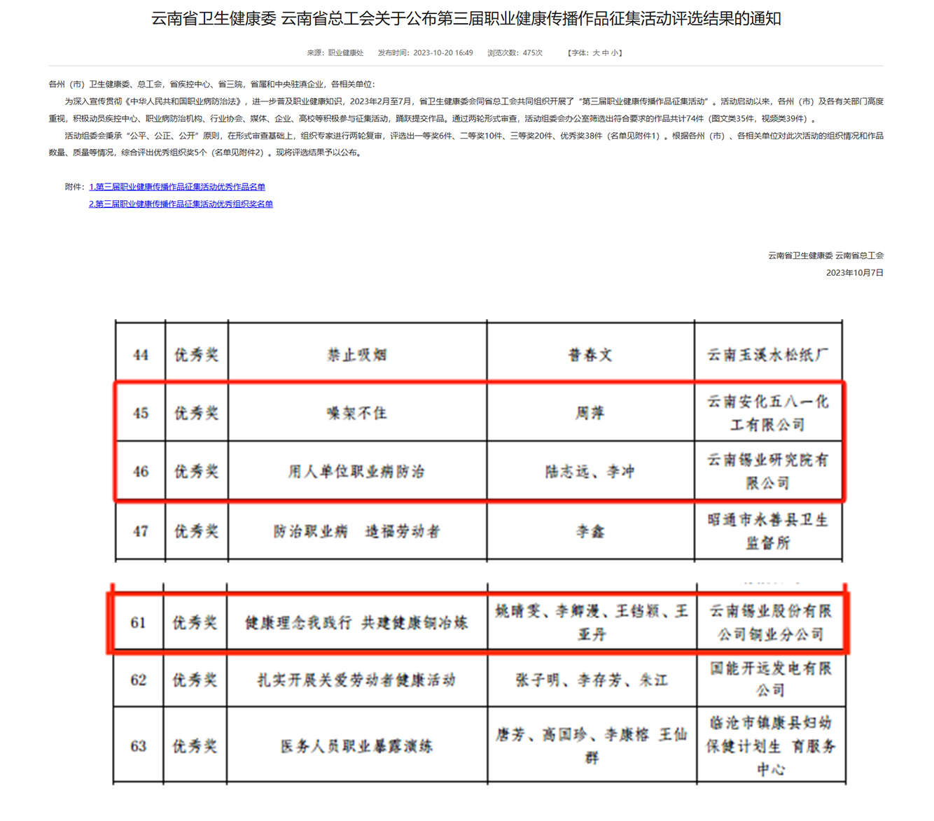 近日,由國(guó)家衛(wèi)生健康委和中華全國(guó)總工會(huì)統(tǒng)一部署,省衛(wèi)生健康委和省總工會(huì)聯(lián)合舉辦第三屆職業(yè)健康傳播作品征集活動(dòng)評(píng)選結(jié)果揭曉,研究院公司選送的《用人單位職業(yè)病防治》;安化五八一公司選送的《噪架不住》;銅業(yè)分公司選送的《健康理念我踐行共建健康銅冶煉》3件作品均榮獲優(yōu)秀獎(jiǎng)。