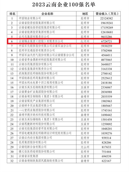 近日,由云南省企業聯合會、云南省企業家協會公開發布的“2023云南企業100強”新鮮出爐。云錫位列第6位。