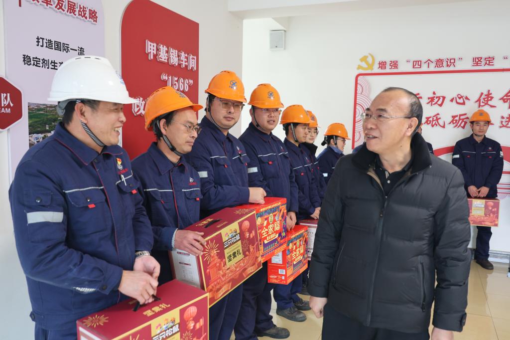 在錫化工有機錫生產基地,孫勇與干部職工親切交流,對他們的辛勤付出和所作貢獻表示感謝,向職工及家屬致以節日問候和新春祝福。孫勇強調,春節期間工作責任尤為重大,壓力也相應增加,要再接再厲,全力以赴做好各項工作,加強安全隱患排查與應急準備,確保春節期間安全生產平穩有序。(吳云龍)
