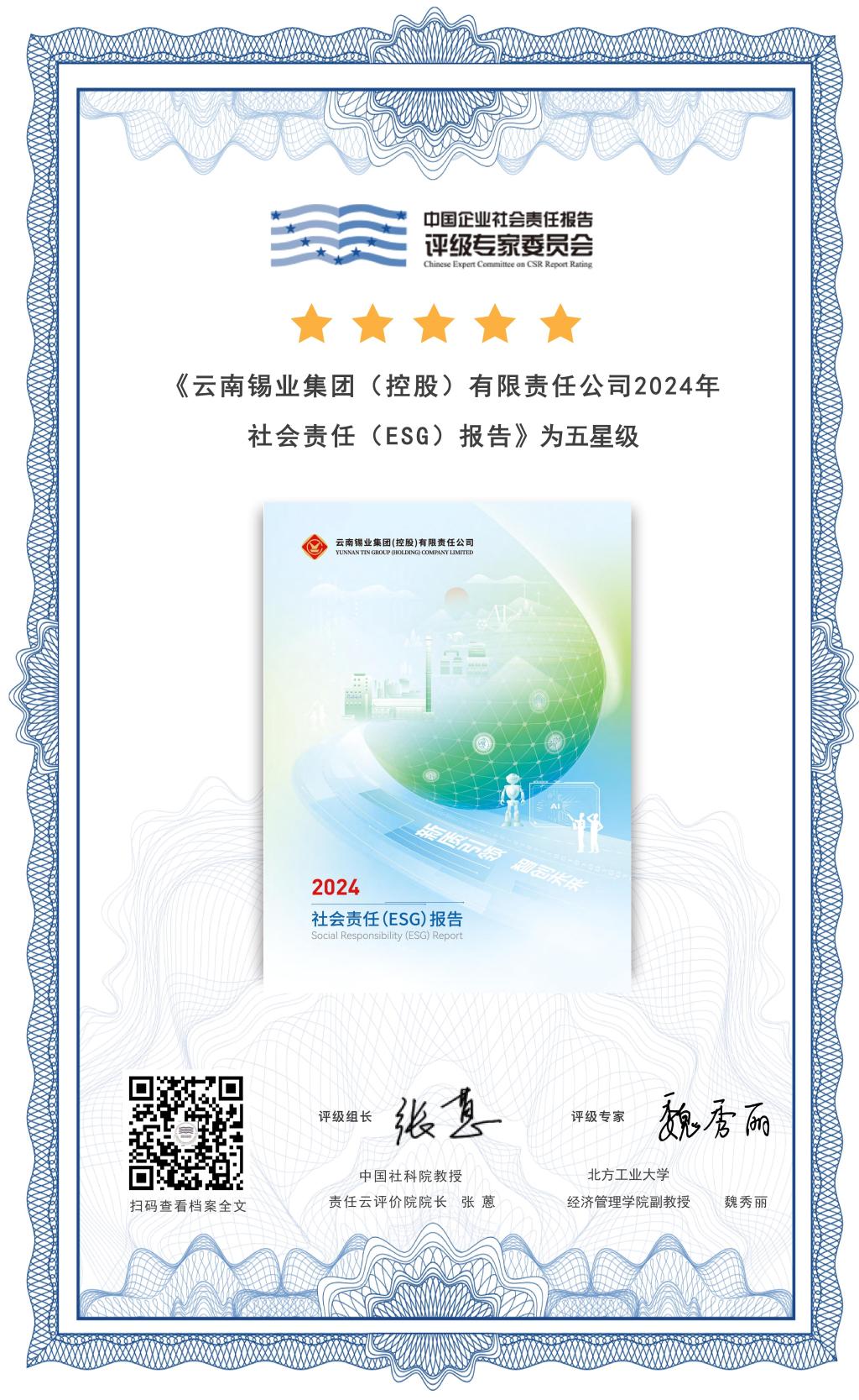 近日,經(jīng)中國企業(yè)社會責任報告評級專家委員會評定,《云南錫業(yè)集團(控股)有限責任公司2024年社會責任(ESG)報告》獲評“五星級”,被評價為“是一份卓越的企業(yè)可持續(xù)發(fā)展報告”。這是云錫連續(xù)兩年斬獲“五星級”權(quán)威評級,體現(xiàn)了業(yè)界對云錫長期堅持可持續(xù)發(fā)展、積極傳遞責任價值的充分認可與肯定,進一步提升了公司在ESG領(lǐng)域的品牌形象。