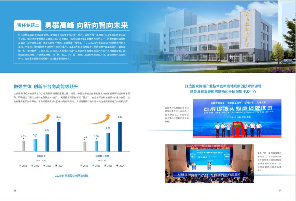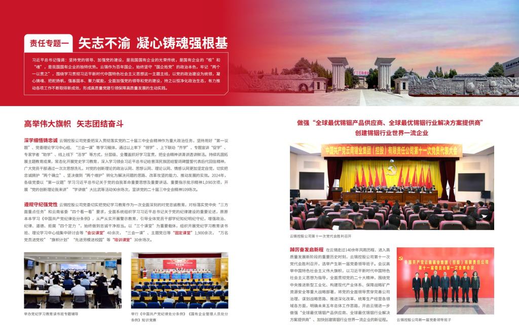 《報告》設置“矢志不渝 凝心鑄魂強根基”“勇攀高峰 向新向智向未來”兩大責任專題,貫穿深入學習貫徹習近平新時代中國特色社會主義思想和黨的二十大精神主線,聚焦“做強兩個全球最優(yōu)、創(chuàng)建錫銦行業(yè)世界一流”和“打造具有核心競爭力的創(chuàng)新高地”兩條軸線,生動展現(xiàn)云錫在全面加強黨的領(lǐng)導、以高質(zhì)量黨建引領(lǐng)高質(zhì)量發(fā)展、推動科技自立自強等方面取得的突出成效。
