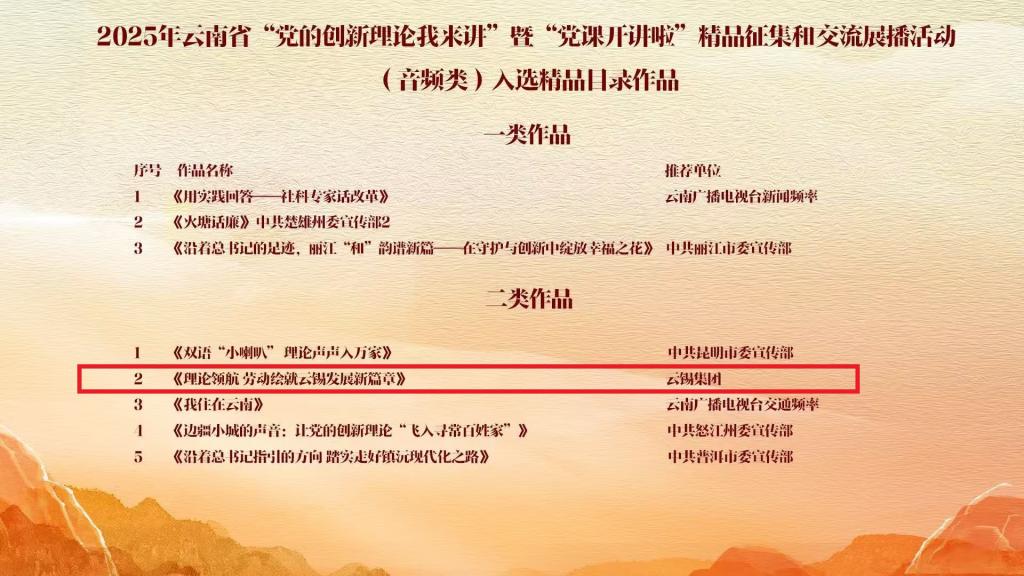 此次作品選送在控股公司黨委的堅(jiān)強(qiáng)領(lǐng)導(dǎo)下,由控股公司黨群工作部、工會聯(lián)合各基層單位精心組織、協(xié)同發(fā)力、擇優(yōu)推薦,通過省國資委黨委初審、省委宣傳部組委會評議及專家組評審,職業(yè)學(xué)院音頻類作品《理論領(lǐng)航 勞動繪就云錫發(fā)展新篇章》獲評“二類作品”,被列為2025年全省廣播電視和網(wǎng)絡(luò)視聽創(chuàng)新創(chuàng)優(yōu)扶持項(xiàng)目。新材料公司、錫化工公司、錫業(yè)分公司聯(lián)合制作的視頻類作品《牢記囑托 感恩奮進(jìn) 向新而行 錫引未來》獲評“優(yōu)秀作品”。
