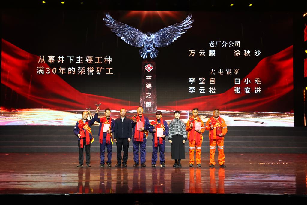 李琦、李梅為從事井下主要工種滿25年的榮譽(yù)礦工代表、“云錫之鷹”云錫勞動(dòng)模范頒獎(jiǎng)并合影。