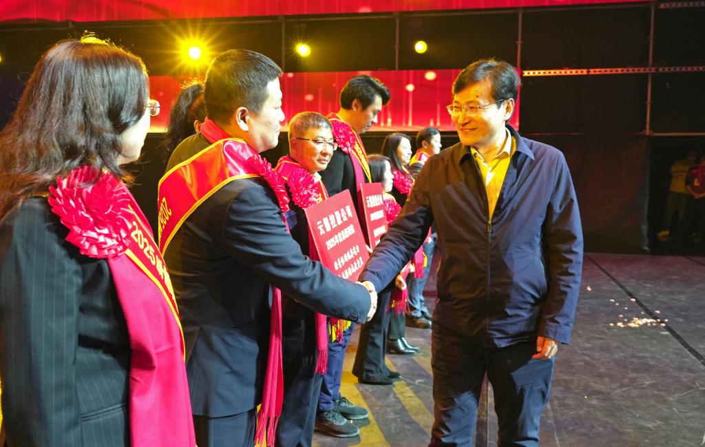 控股公司黨委副書(shū)記、副董事長(zhǎng)、總經(jīng)理韓守禮為2025年控股公司總經(jīng)理獎(jiǎng)獲獎(jiǎng)團(tuán)隊(duì)代表頒獎(jiǎng)并合影。