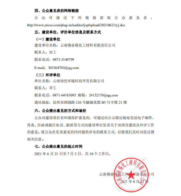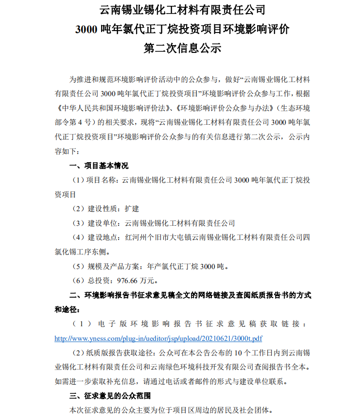 云南錫業錫化工材料有限責任公司3000噸/年氯代正丁烷投資項目環境影響評價第二次信息公示