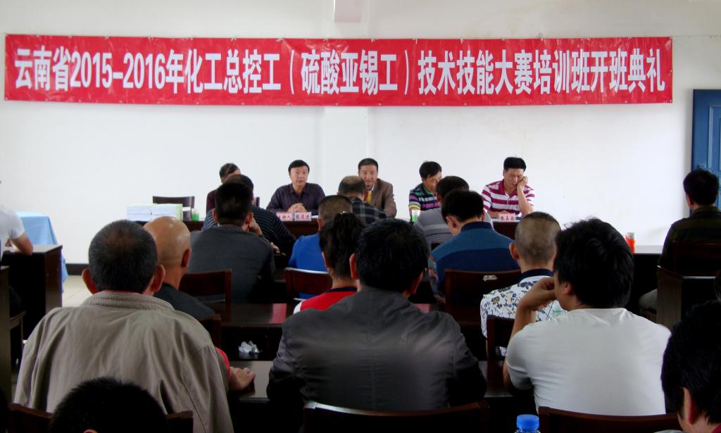 9月14日,云南省2015-2016年化工總控工(硫酸亞錫工)技術技能大賽培訓班開班典禮在火谷都無機錫化工中心舉行。控股公司工會副主席向鵬飛,控股公司工會辦公室主任、生產保護部部長張邁進,控股公司人力資源部培訓科長胡光輝,化工材料分公司副經理朱金能等參加開班典禮。張邁進主持開班典禮。