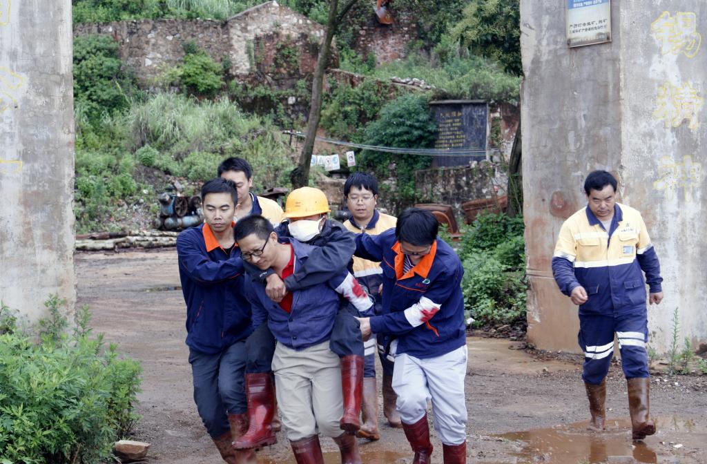 演練模擬2095平面望鄉(xiāng)臺(tái)因?yàn)檫B日降雨引發(fā)泥石流,現(xiàn)場(chǎng)管理人員立即報(bào)告坑口值班人員,值班人員電話報(bào)告礦應(yīng)急指揮部。接到險(xiǎn)情報(bào)告后,應(yīng)急演練總指揮、副礦長林增洪立即啟動(dòng)應(yīng)急處理機(jī)制,命令拉響災(zāi)情警報(bào),組織救援人員火速前往事故現(xiàn)場(chǎng)進(jìn)行處置,同時(shí)向上級(jí)部門報(bào)告。