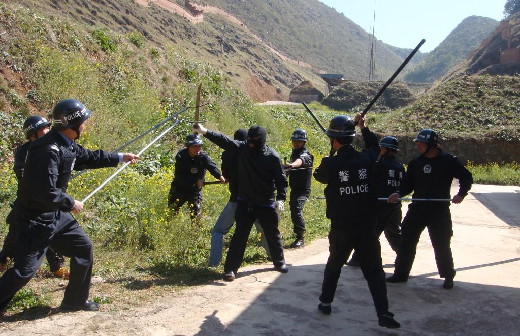 演練一開始,兩名手持大刀的蒙面恐怖分子從庫區圍墻外草叢中穿出,悄悄爬上庫區圍墻鐵絲網,企圖進入炸藥庫實施破壞活動。此時,他們的一舉一動已經進入了庫區值班室的監控視頻,紅外線電子對射器立刻發出警報,值班員立即按響電鈴向庫區值班經警報警,并同時向110、老廠派出所、儲運保衛科、老廠分礦保衛科報警。而此時兩名恐怖分子全然不知自己已經處于經警的控制之中,從圍墻翻進庫區,摸到一號庫正準備撬門扭鎖打開庫房門。庫區正在巡邏的兩名經警在慢慢隱蔽地接近恐怖分子后,奮勇沖出,與恐怖分子展開搏斗。此時,外圍的經警接到報警,拿上配備的反恐器材迅速趕到庫區和庫區巡邏的兩名經警一起將恐怖分子圍住,經過一番激烈搏斗,終將兩名恐怖分子制服抓獲。
