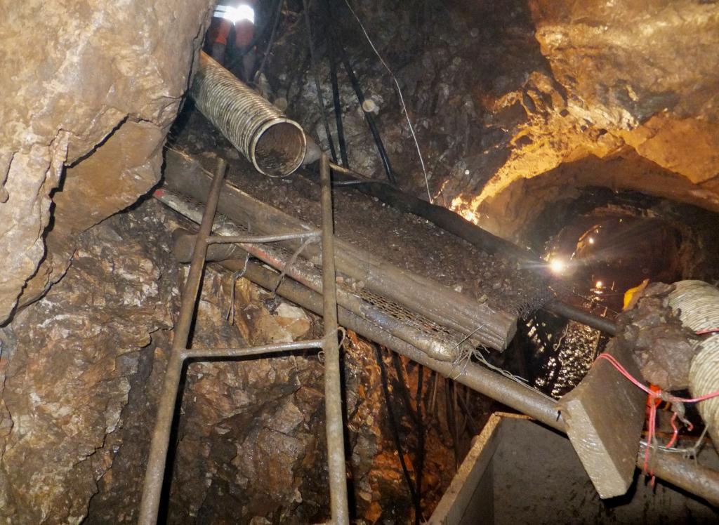 為此,采一隊隊長代普桃積極開動腦筋自制了一個格篩塃倉,解決了坑口的問題。塃倉由兩根舊鐵道和一塊小網格的錨網組成,在出礦口將兩根鐵道按照一定的傾角固定好后,將錨網固定在鐵道間,再在錨網底部開挖一個沉淀池,最后在塃倉口擺放一個礦車用于接廢石,一個格篩塃倉就制作完成了。出礦時,人員用高壓水將通道內的礦石沖運到錨網上,由于錨網具有一定傾角,礦石又為砂狀,廢石就會滾到礦車內,沖積礦則漏到沉淀池內,工作人員再從沉淀池裝袋運出坑口就完成了工作。