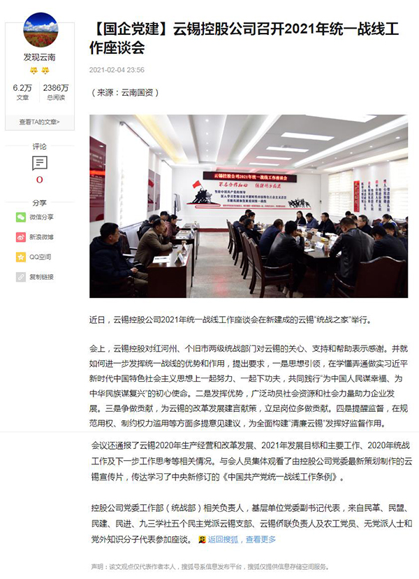 云南國資、搜狐網(wǎng):【國企黨建】云錫控股公司召開2021年統(tǒng)一戰(zhàn)線工作座談會