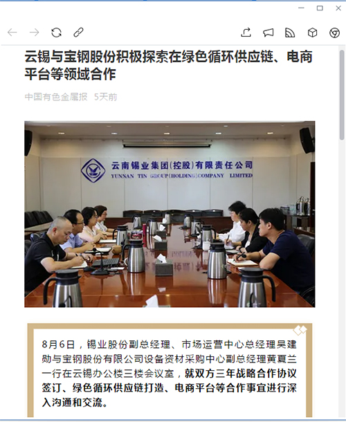 8月6日,錫業股份副總經理、市場運營中心總經理吳建勛與寶鋼股份有限公司設備資材采購中心副總經理黃夏蘭一行在云錫辦公樓三樓會議室,就雙方三年戰略合作協議簽訂、綠色循環供應鏈打造、電商平臺等合作事宜進行深入溝通和交流。
