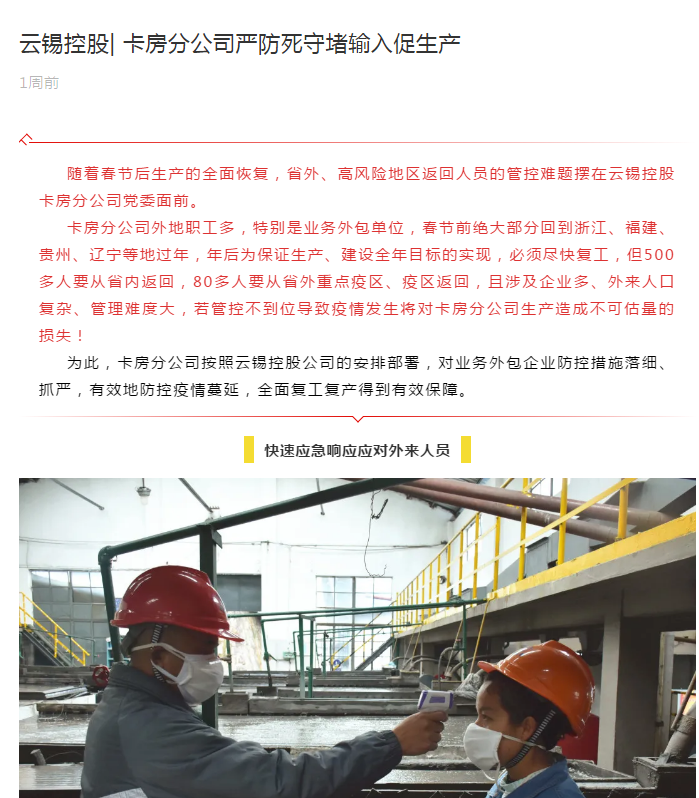 “卡房分公司復工復產后,多措并舉抓好疫情防控工作,復工復產形勢良好,復工率在90%以上,金竹林坑、冬瓜林坑銅、錫產量保持原有水平,基本沒有受到疫情影響。“2020年一月份生產經營完成較好。”卡房分公司黨委書記賽德輝說。