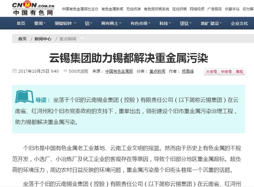 云錫集團作為國有特大型企業(yè)集團,承擔(dān)起國有企業(yè)的社會責(zé)任。與個舊市委、市政府,加強溝通協(xié)作,有效推進重金屬污染綜合防治工作。