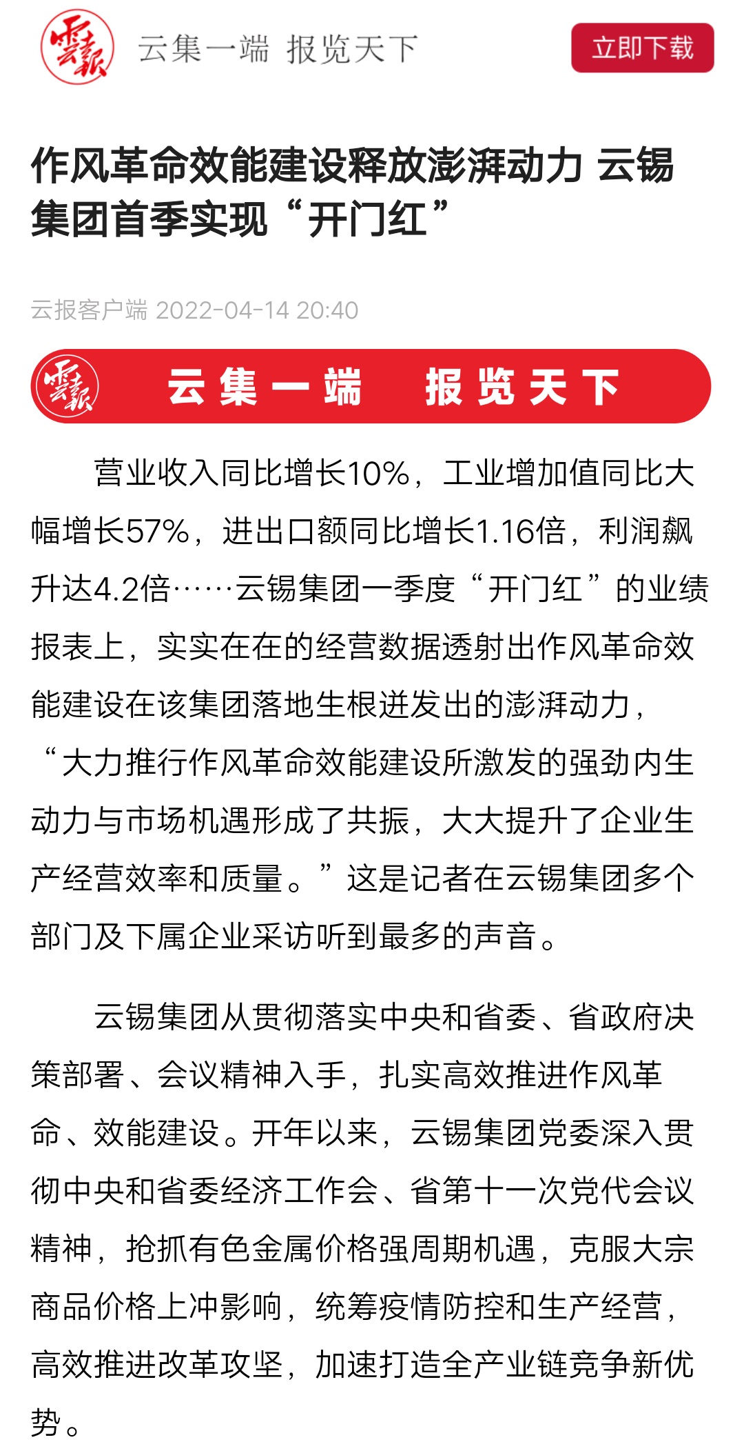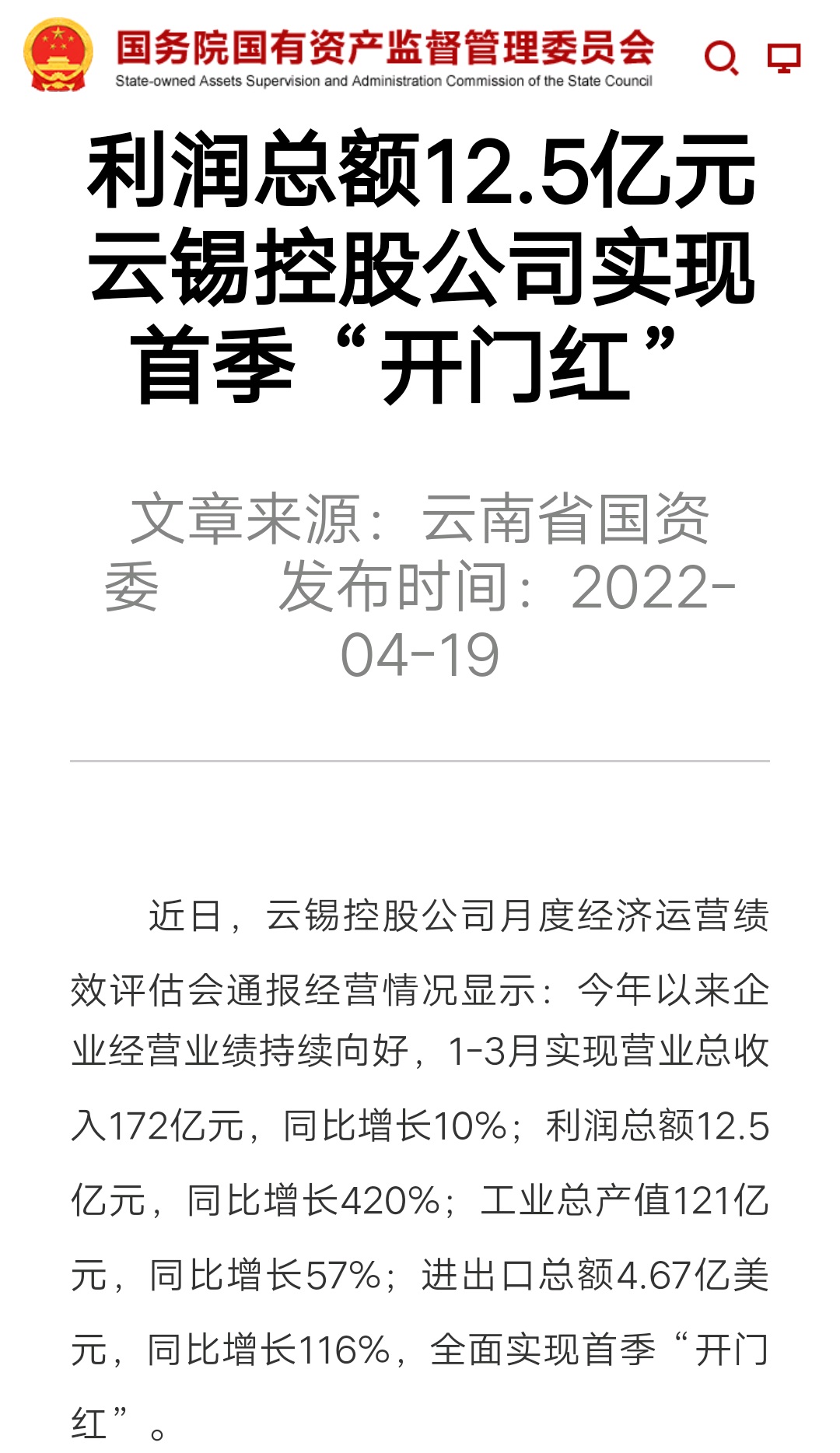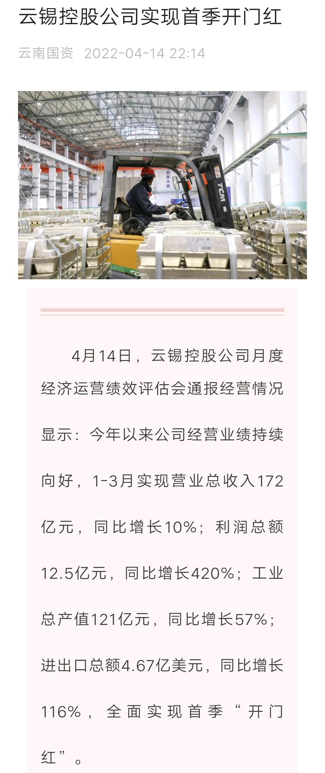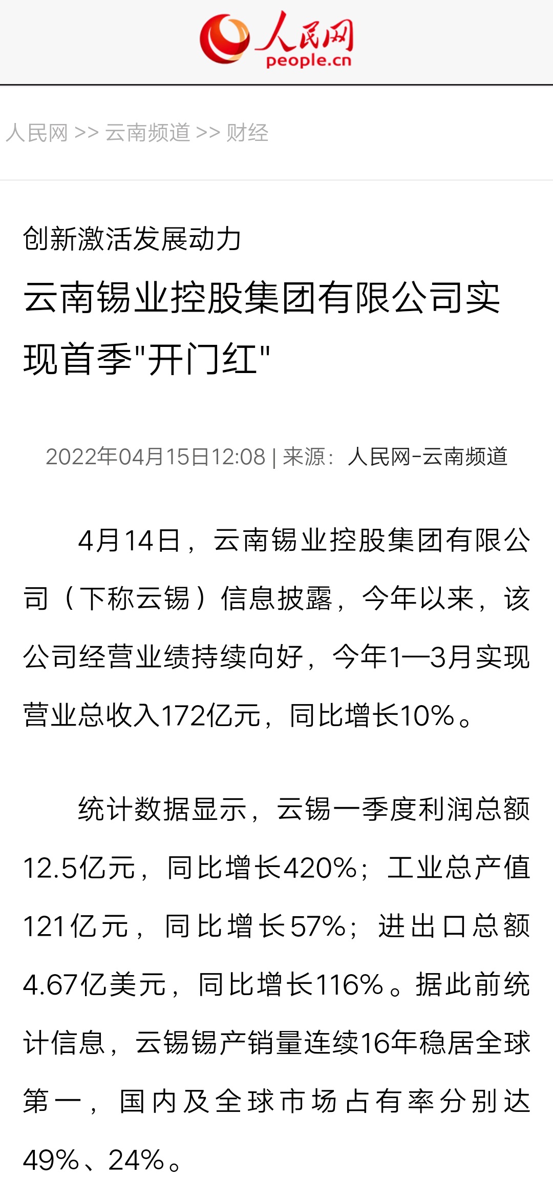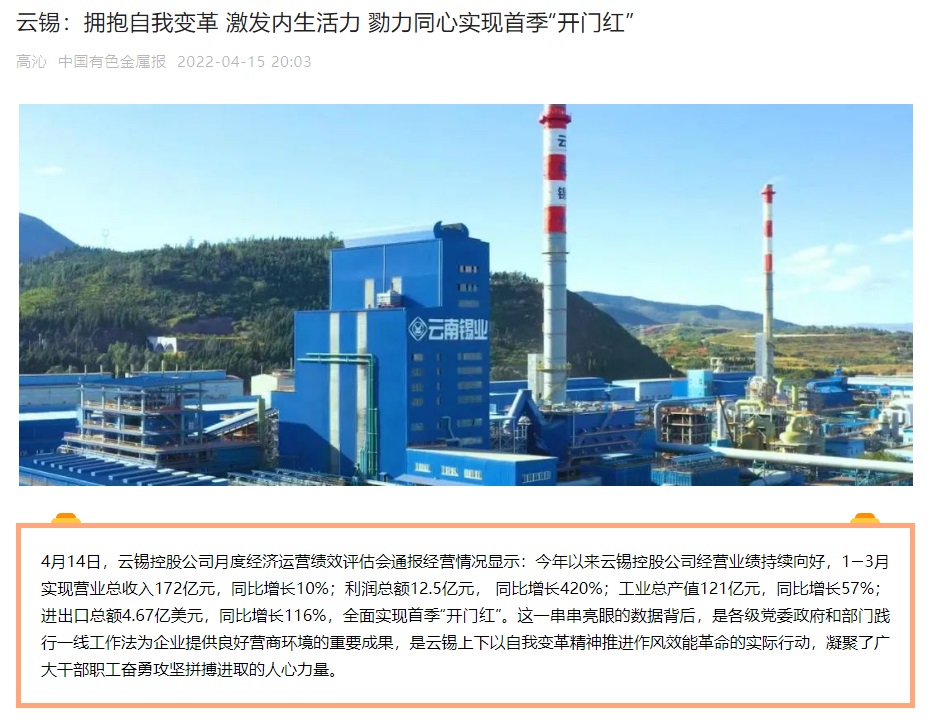 媒體關(guān)注| 人民網(wǎng)、新華財(cái)經(jīng)、云報(bào)、云南國資等媒體關(guān)注云錫實(shí)現(xiàn)首季開門紅