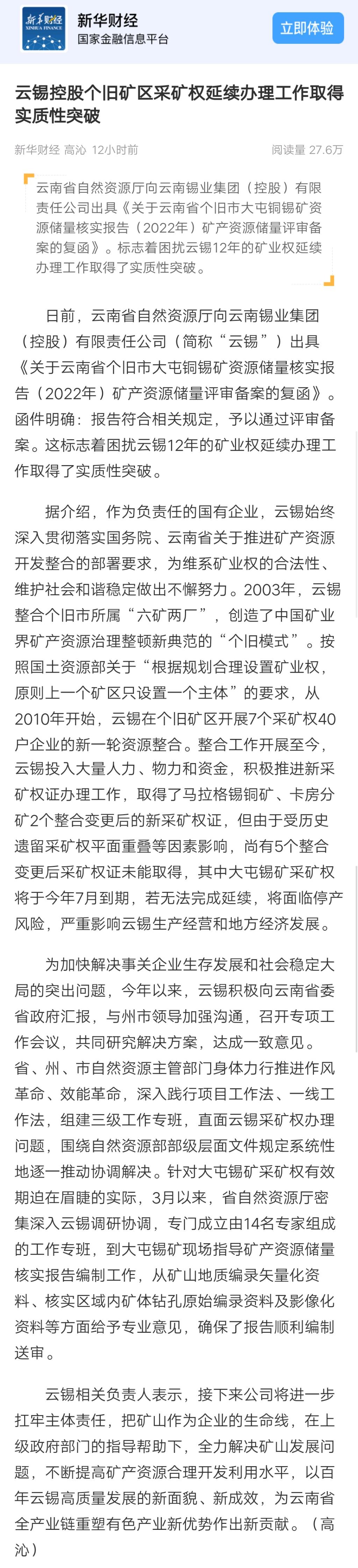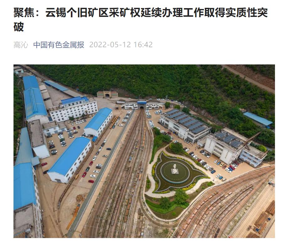 新華財經、 中國有色金屬報:云錫控股個舊礦區采礦權延續辦理工作取得實質性突破
