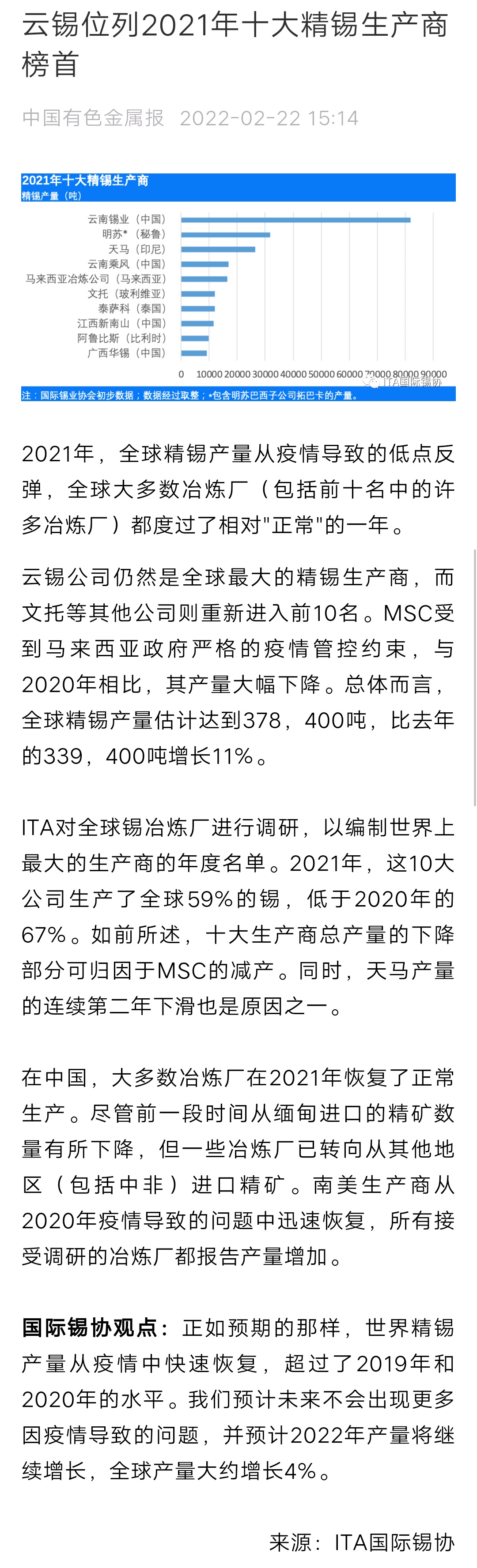 ITA國際錫協:云錫位列2021年十大精錫生產商榜首