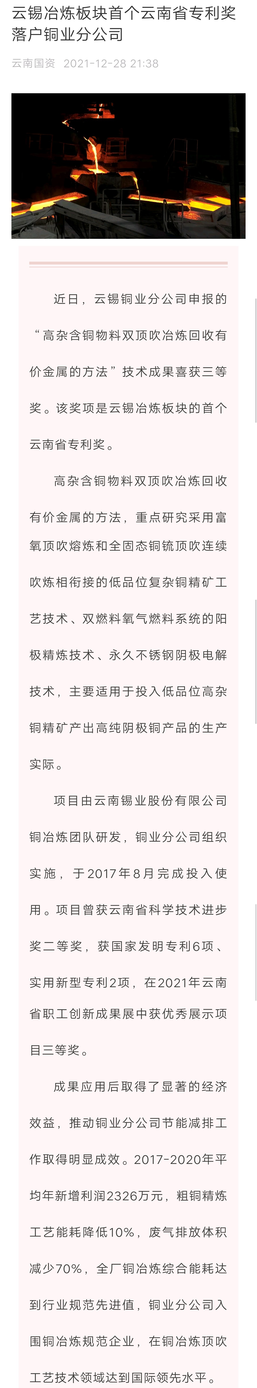 【云南國資、中國有色金屬報】云錫冶煉板塊首個云南省專利獎落戶銅業分公司