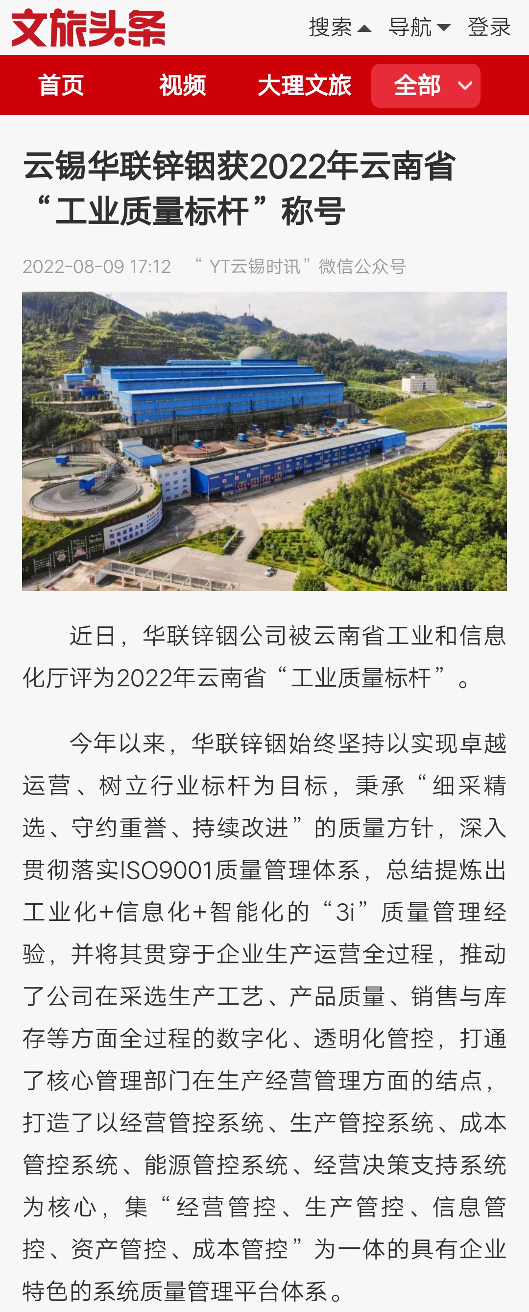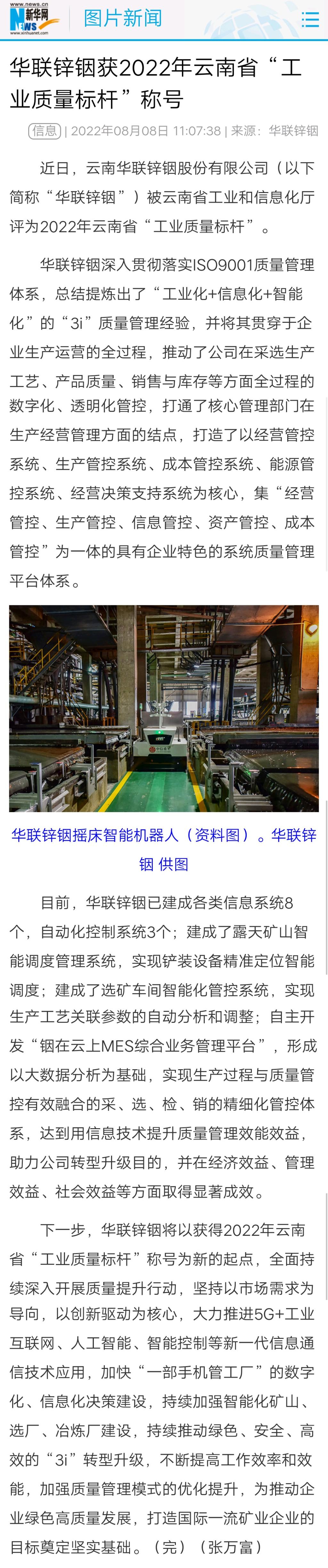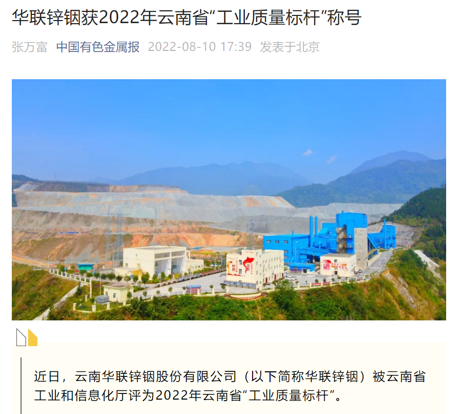 新華網、云南政協、中國有色報、文旅頭條:華聯鋅銦獲2022年云南省“工業質量標桿”稱號