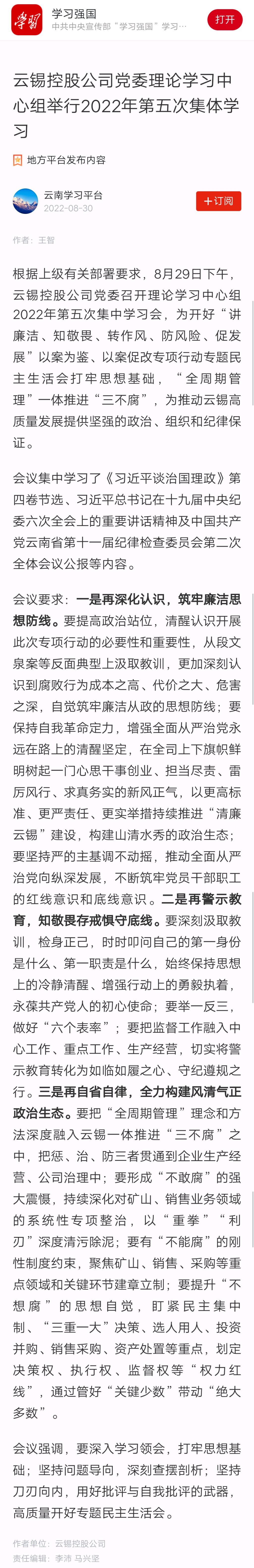 學(xué)習(xí)強(qiáng)國:云錫控股公司黨委理論學(xué)習(xí)中心組舉行2022年第五次集體學(xué)習(xí)