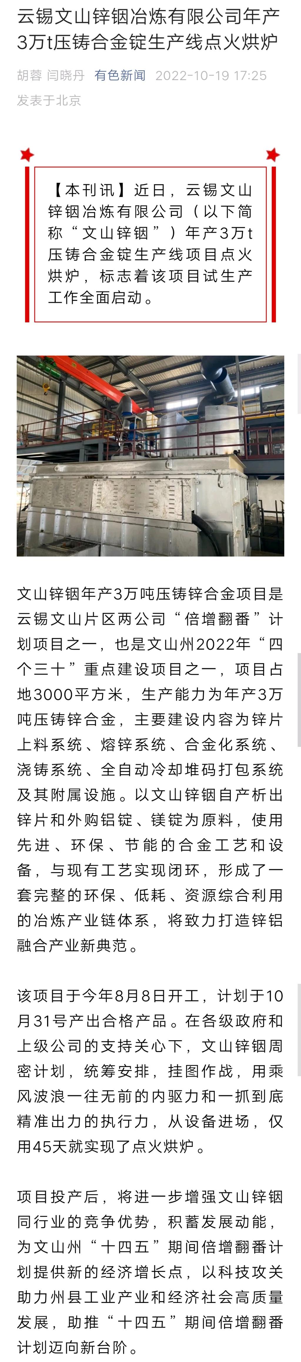 有色新聞:云錫文山鋅銦冶煉有限公司年產(chǎn)3萬(wàn)t壓鑄合金錠生產(chǎn)線點(diǎn)火烘爐