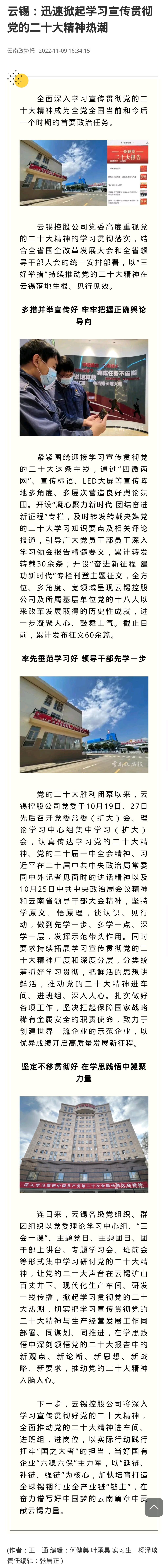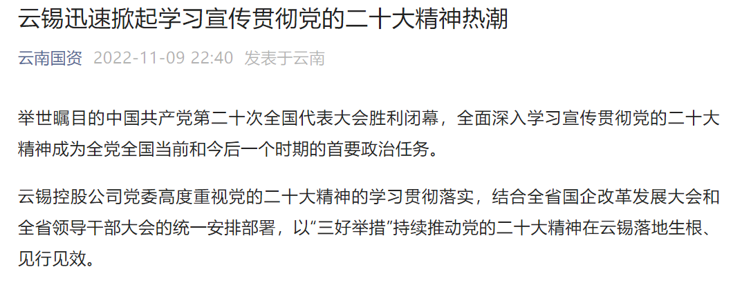 云南國資、云南政協報:云錫迅速掀起學習宣傳貫徹黨的二十大精神熱潮