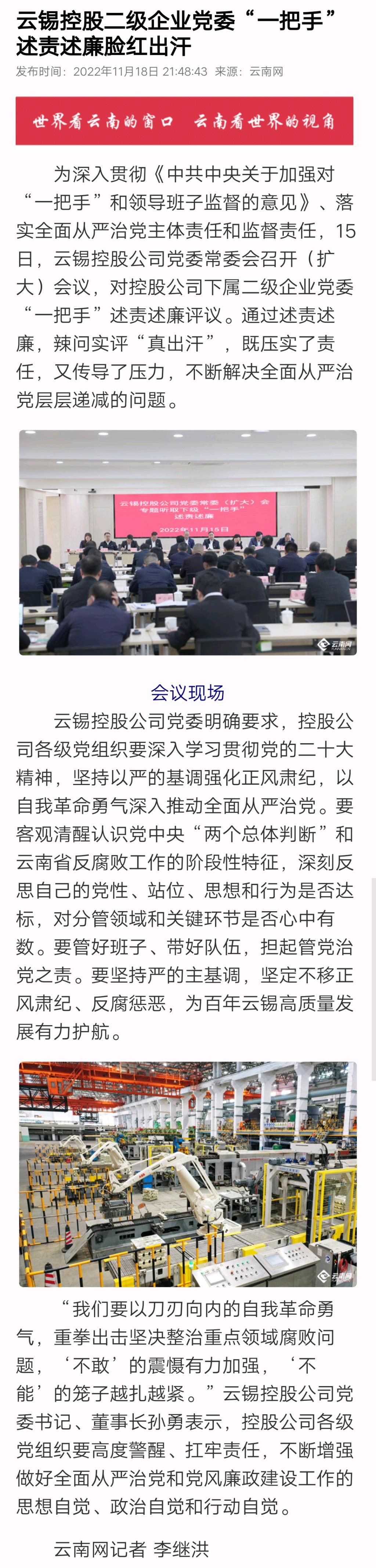 云南網:云錫控股二級企業黨委“一把手”述責述廉臉紅出汗