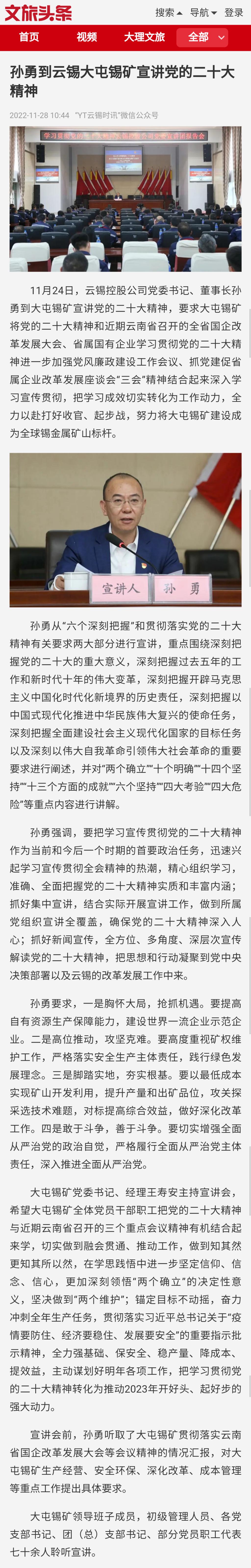文旅頭條:孫勇到云錫大屯錫礦宣講黨的二十大精神