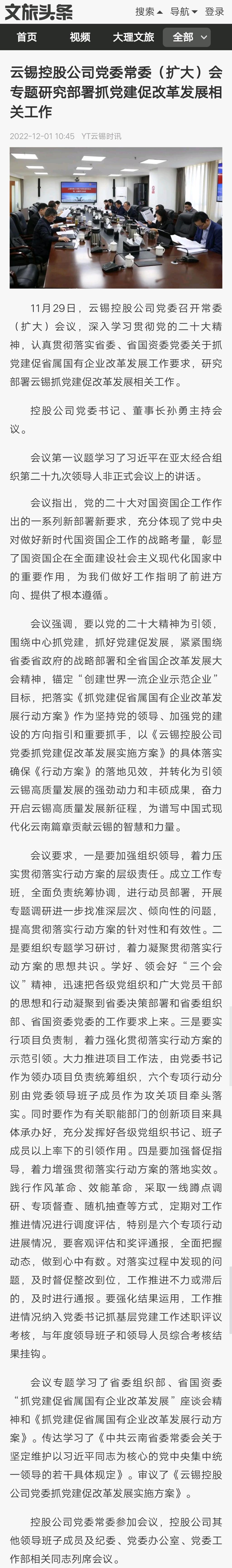 文旅頭條:云錫控股公司黨委常委(擴大)會專題研究部署抓黨建促改革發展相關工作