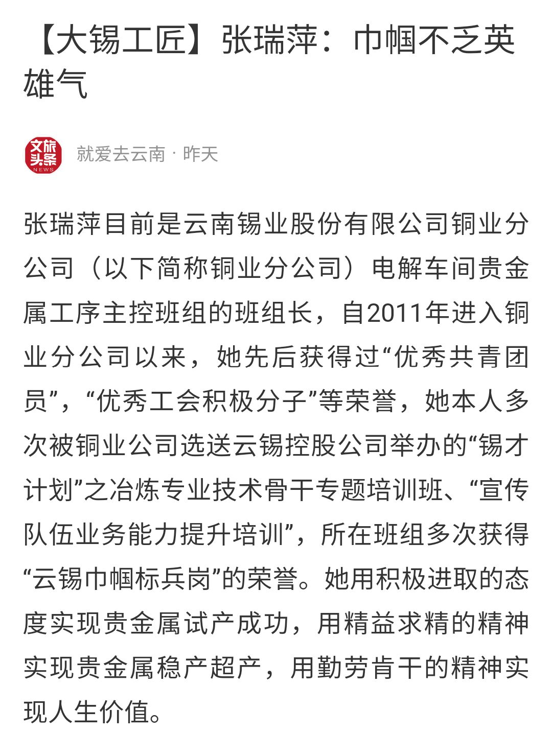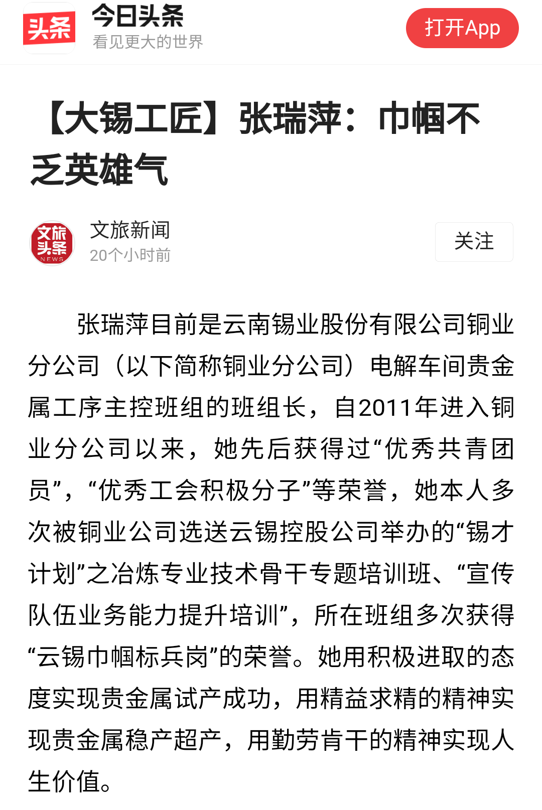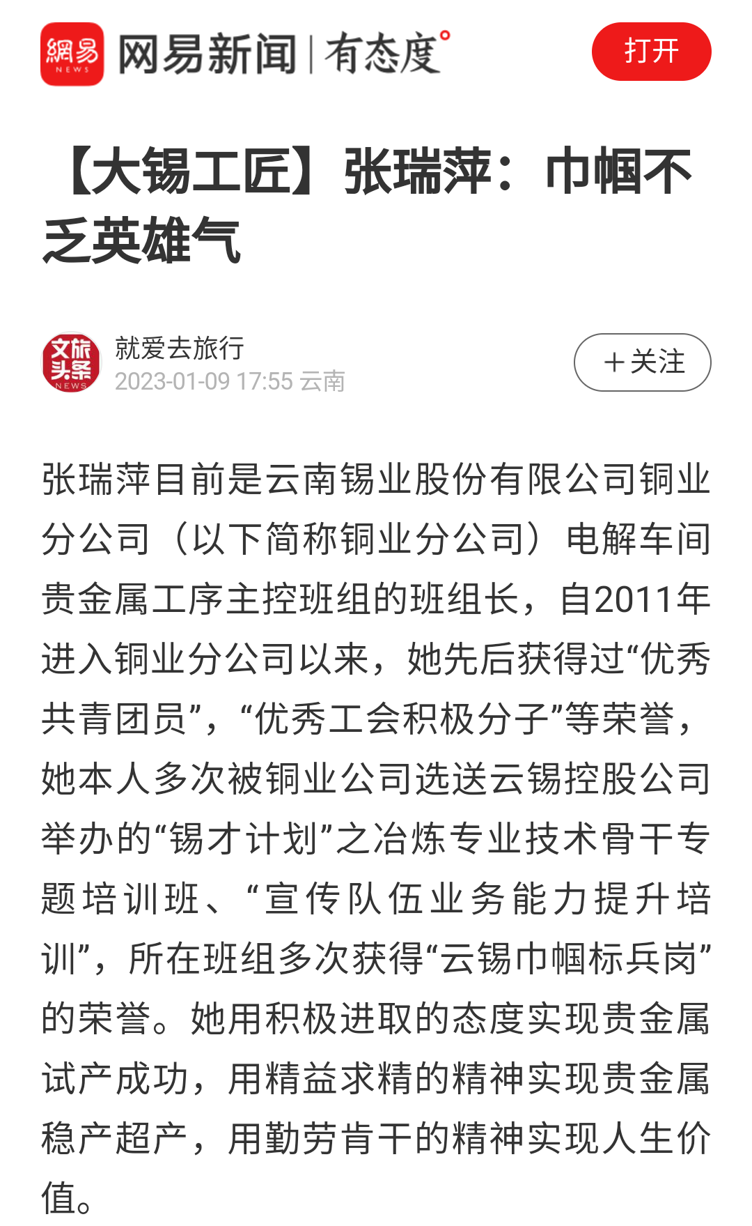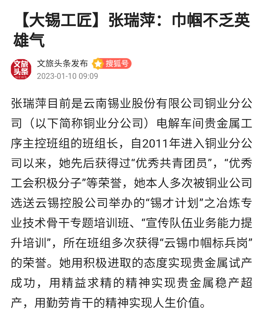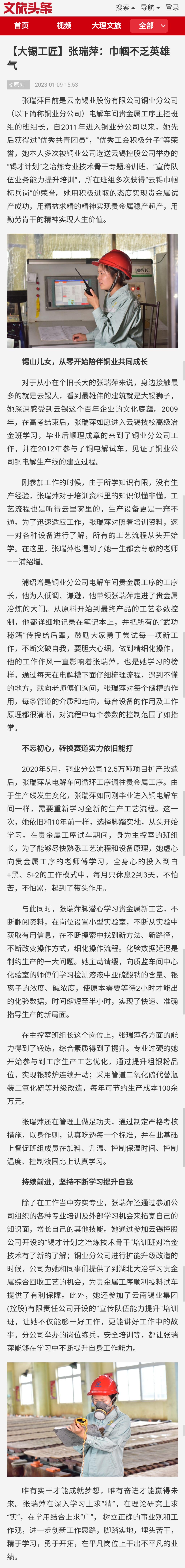 今日頭條、搜狐、一點資訊、網易、阿里文娛、文旅頭條:【大錫工匠】張瑞萍:巾幗不乏英雄氣