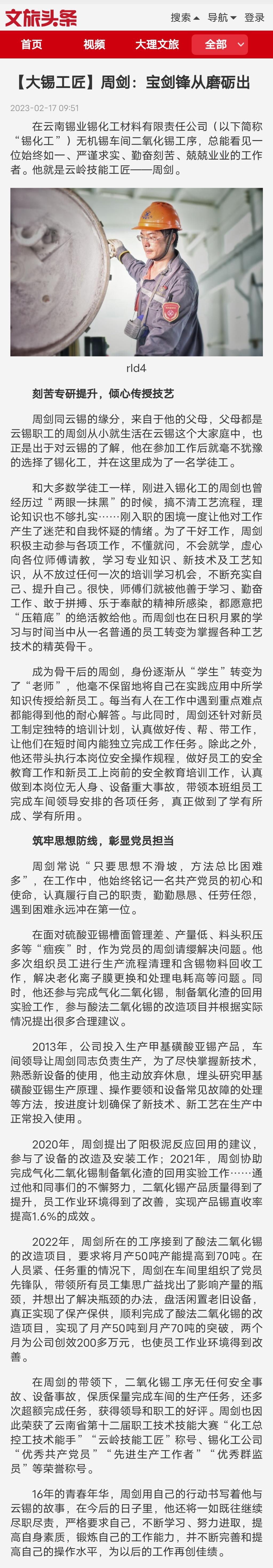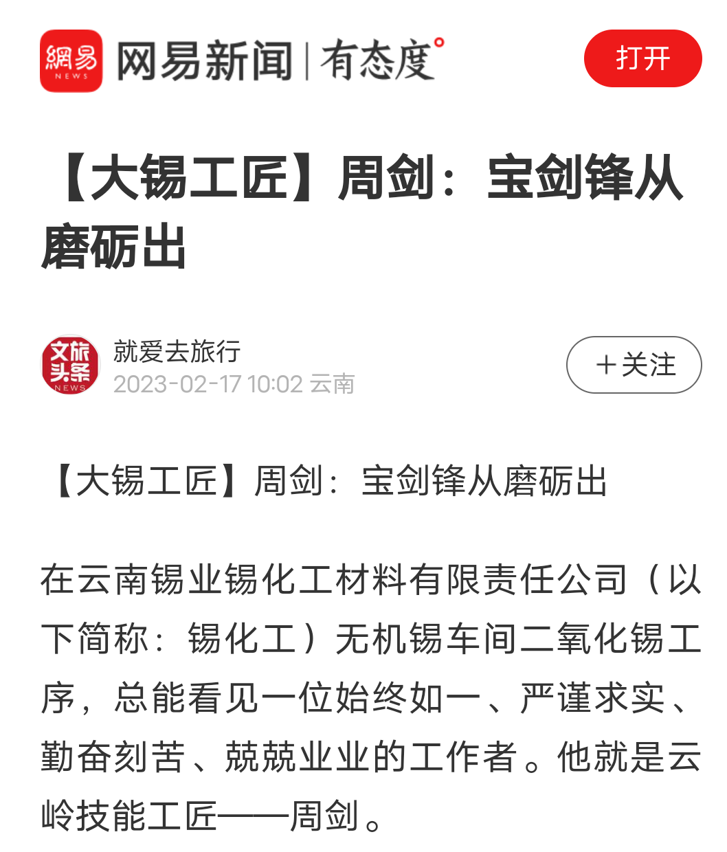 今日頭條、百度、網易、搜狐、一點資訊、文旅頭條:【大錫工匠】周劍:寶劍鋒從磨礪出
