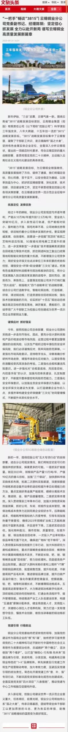 文旅頭條:“一把手”暢談“3815”| 云錫銅業分公司黨委副書記、經理陳鋼:堅定信心抓發展 全力以赴開新局 譜寫云錫銅業高質量發展新篇章