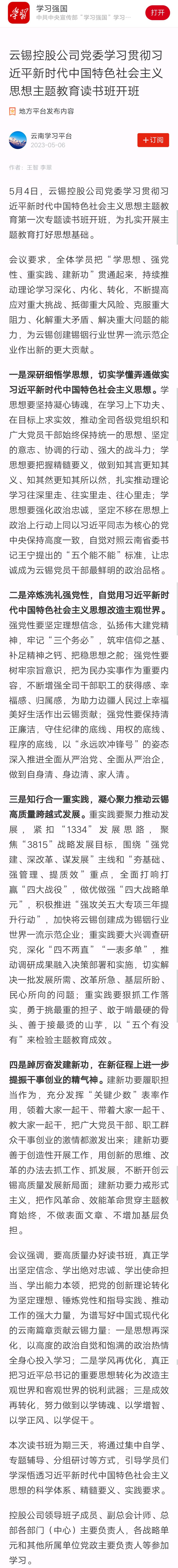 學(xué)習(xí)強(qiáng)國:云錫控股公司黨委學(xué)習(xí)貫徹習(xí)近平新時代中國特色社會主義思想主題教育讀書班開班