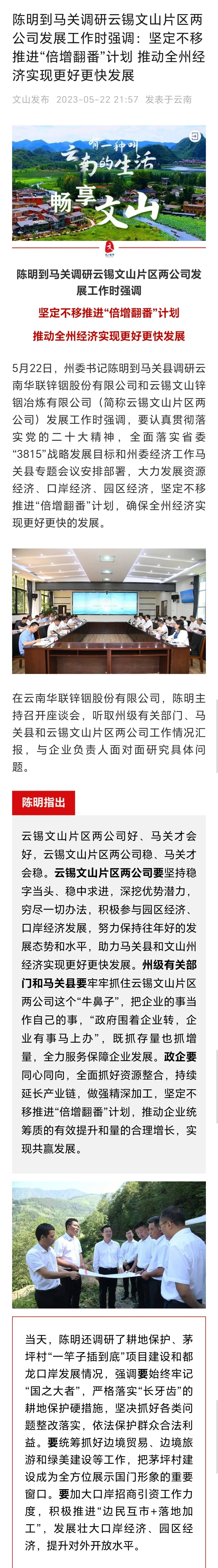 文山發布:陳明到馬關調研云錫文山片區兩公司發展工作時強調:堅定不移推進“倍增翻番”計劃 推動全州經濟實現更好更快發展