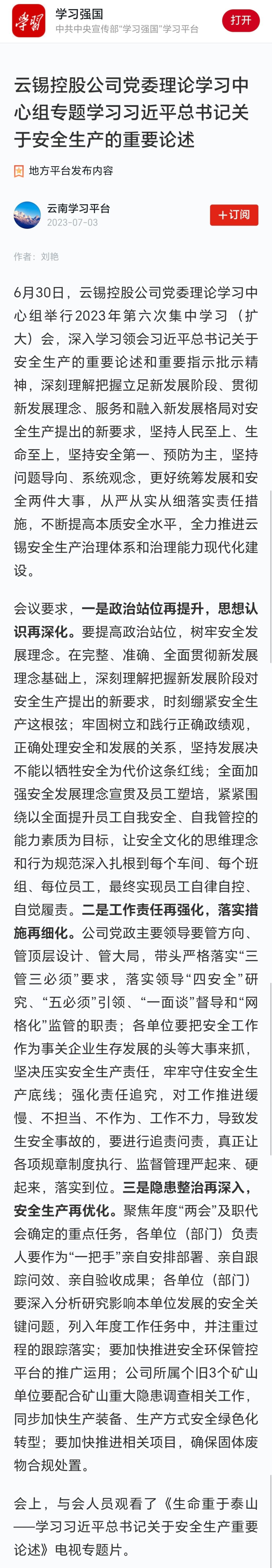 學(xué)習(xí)強(qiáng)國(guó):云錫控股公司黨委理論學(xué)習(xí)中心組專題學(xué)習(xí)習(xí)近平總書記關(guān)于安全生產(chǎn)的重要論述