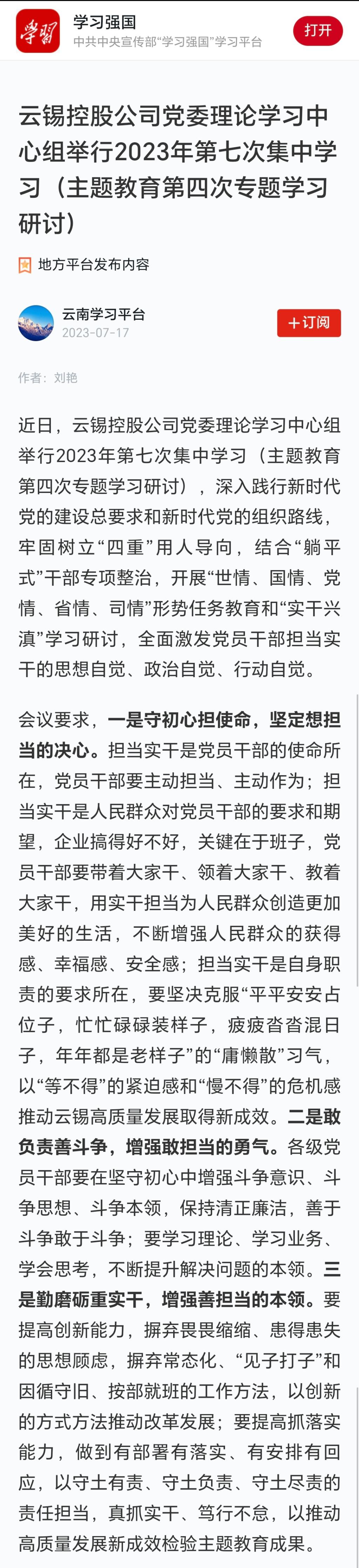 學習強國:云錫控股公司黨委理論學習中心組舉行2023年第七次集中學習(主題教育第四次專題學習研討)