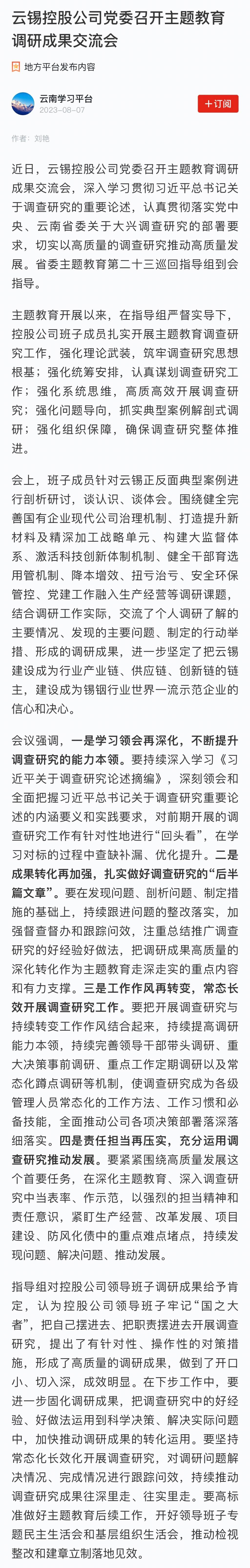 學習強國:云錫控股公司黨委召開主題教育調研成果交流會