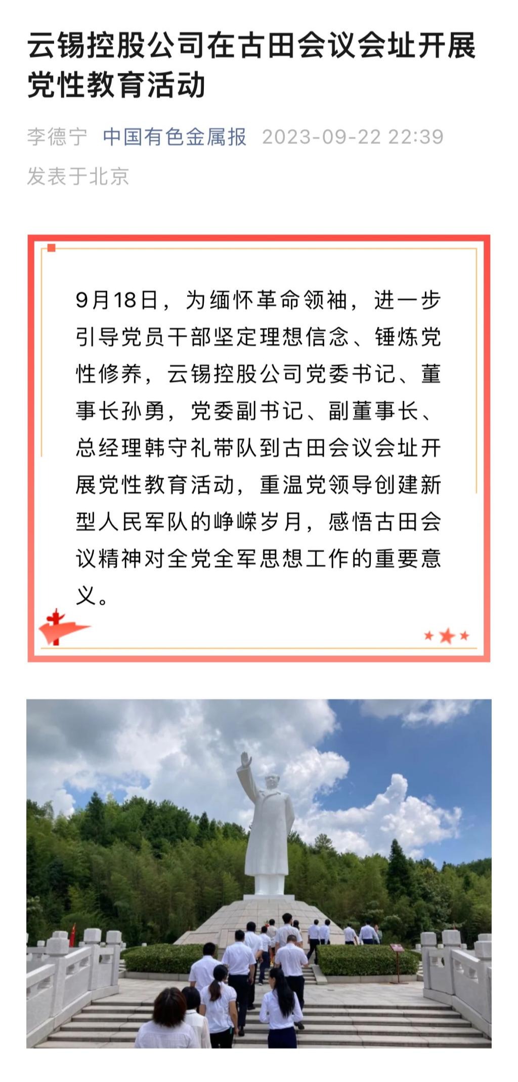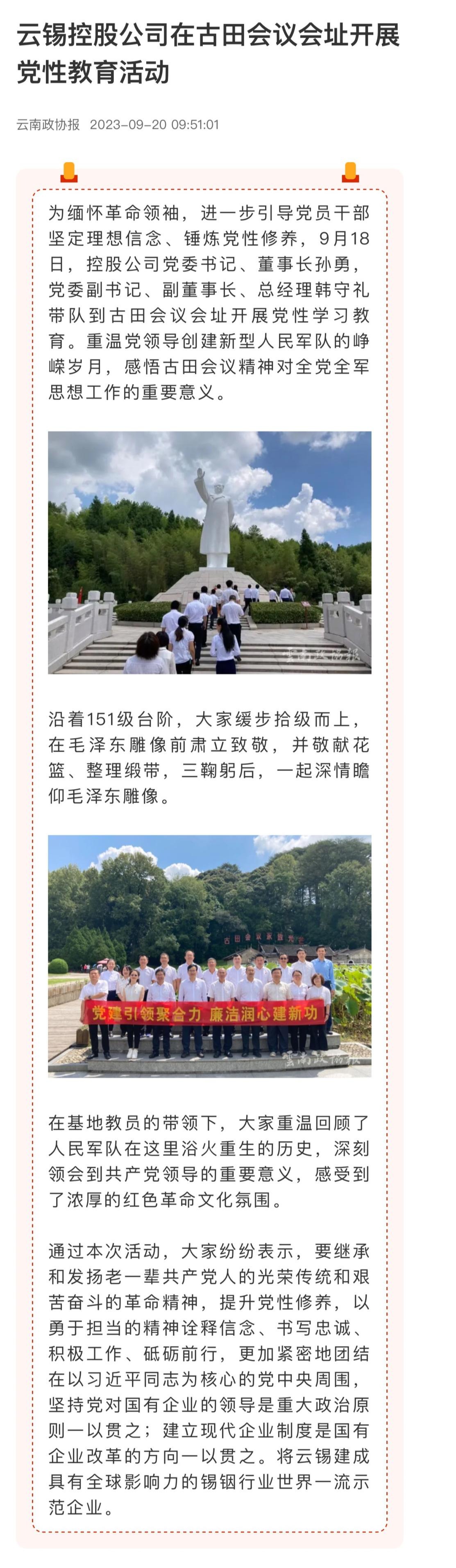 云南政協報、中國有色金屬報:云錫控股公司在古田會議會址開展黨性教育活動