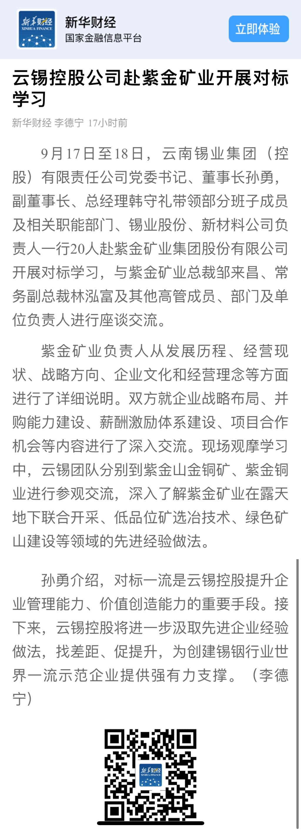 新華財經:云錫控股公司赴紫金礦業開展對標學習
