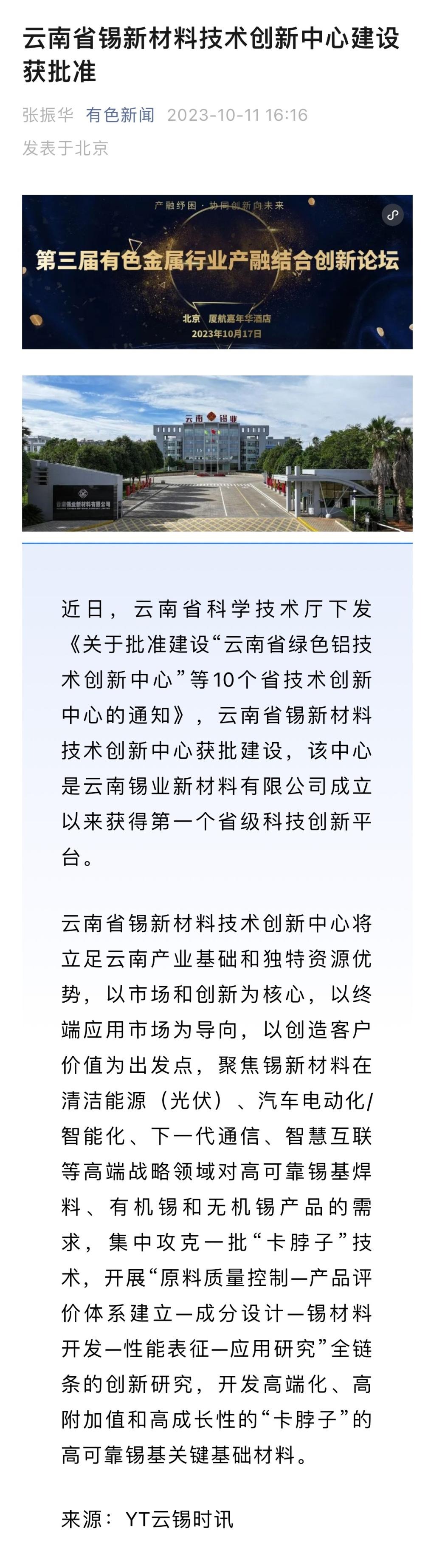 有色新聞:云南省錫新材料技術創新中心建設獲批準