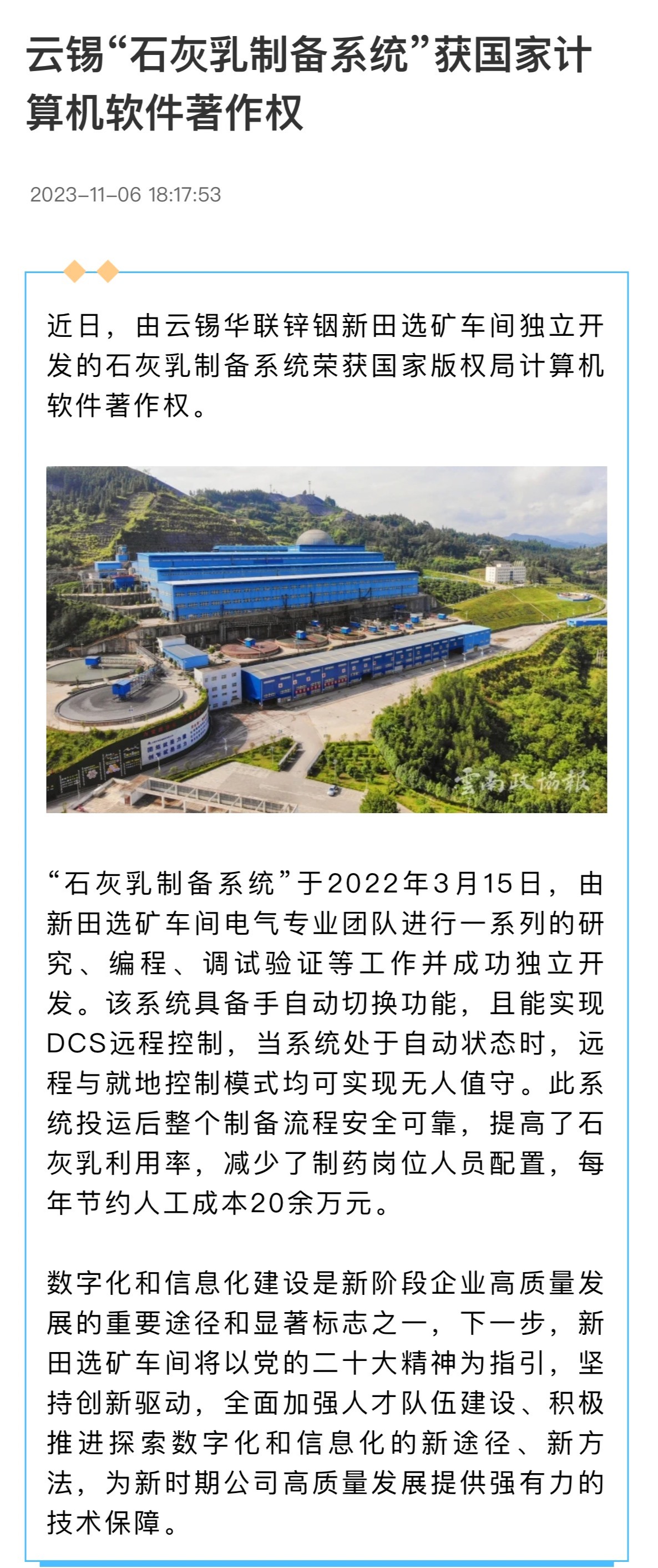 云南政協報:云錫“石灰乳制備系統”獲國家計算機軟件著作權