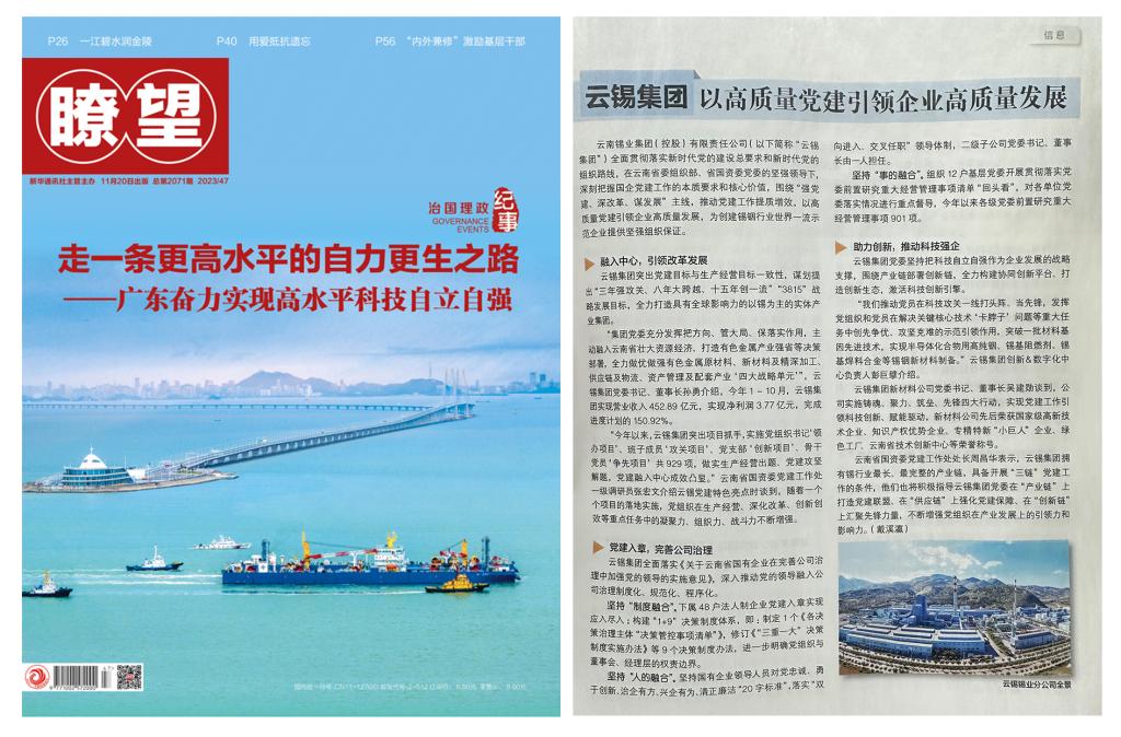 云南錫業集團(控股)有限責任公司(下稱“云錫集團”)全面貫徹落實新時代黨的建設總要求和新時代黨的組織路線,在云南省委組織部、省國資委黨委的堅強領導下,深刻把握國企黨建工作的本質要求和核心價值,圍繞“強黨建、深改革、謀發展”主線,推動黨建工作提質增效,以高質量黨建引領企業高質量發展,為創建錫銦行業世界一流示范企業提供堅強組織保證。