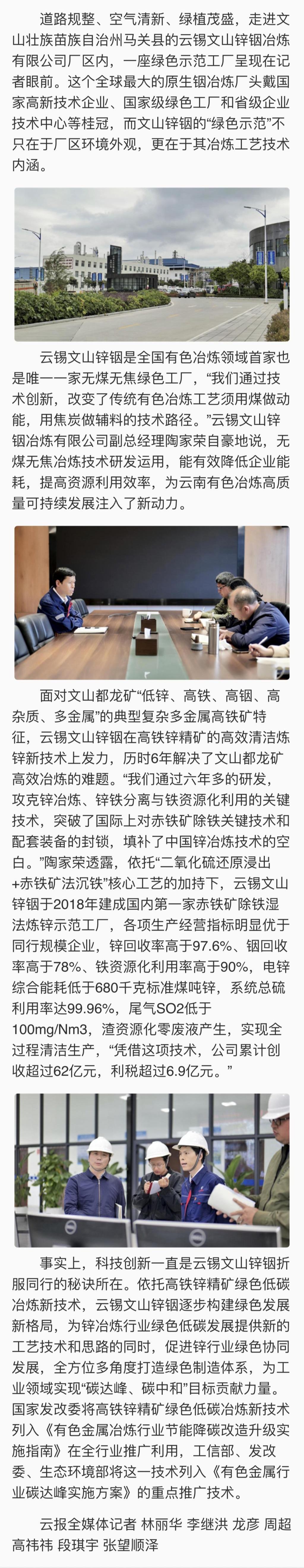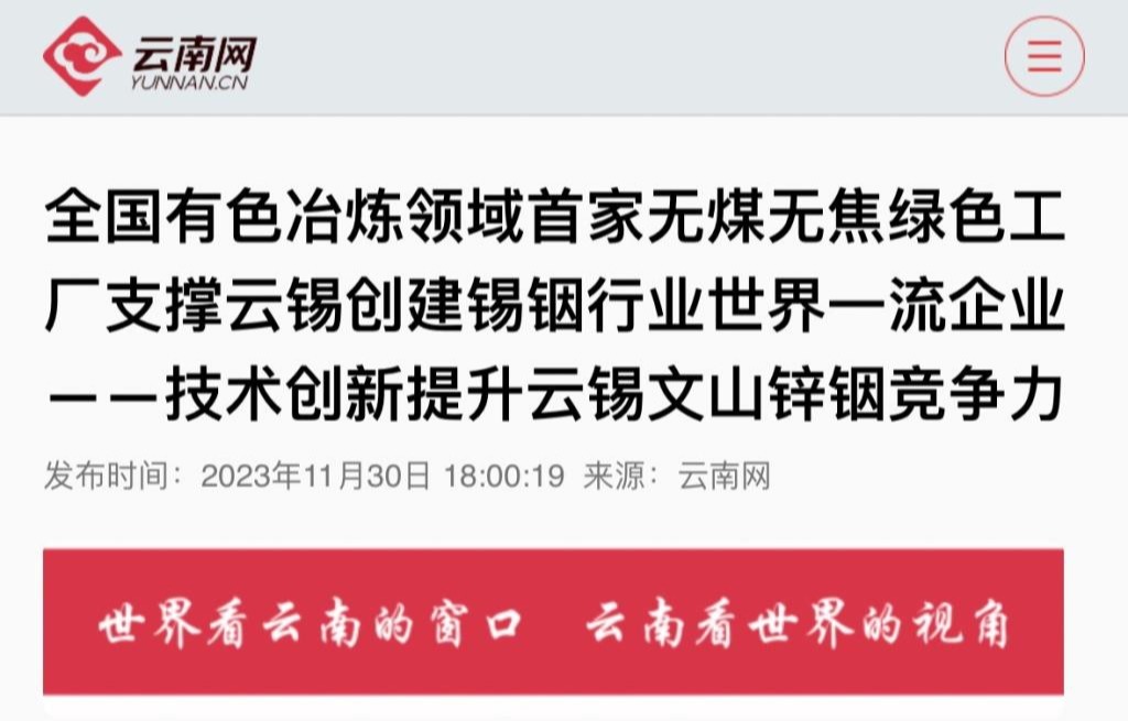 云南網:全國有色冶煉領域首家無煤無焦綠色工廠支撐云錫創建錫銦行業世界一流企業——技術創新提升云錫文山鋅銦競爭力