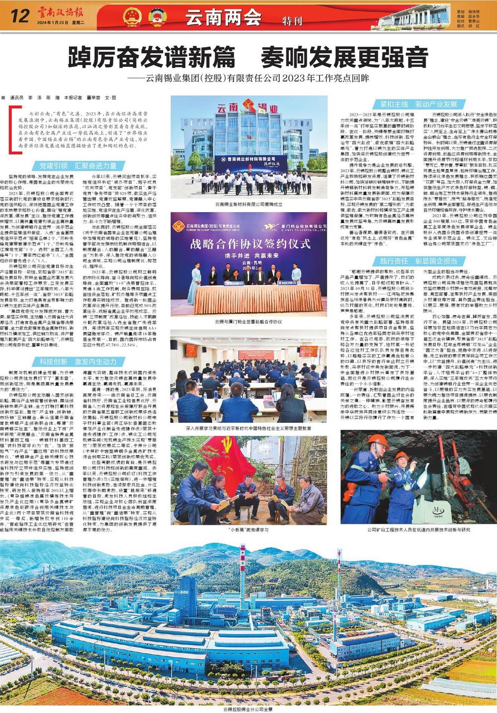 初心如磐,使命在肩,踔厲奮發,篤行不怠。展望2024年,云錫控股公司將更加緊密地團結在以習近平同志為核心的黨中央周圍,全面貫徹省委十一屆五次全會精神,聚焦省委“3815”戰略發展目標,扛牢全球錫銦“雙龍頭”企業“國之大者”擔當,把穩中求進、以進促穩、先立后破的要求貫穿到各項工作之中,以“效益提升、價值創造”為主線,進一步構建 “四大戰略單元”+科技創新平臺、人才培養平臺的“4+2”整體布局,深入實施“三年強攻關”五大專項行動,為創建錫銦行業世界一流企業矢志奮斗,以更強的實力夯實發展基礎、以更大魄力推動項目提速提質、以更優制度提升企業品質、以更深的使命感履行社會責任,在譜寫中國式現代化云南實踐新篇章中展現云錫新作為、貢獻云錫新力量。